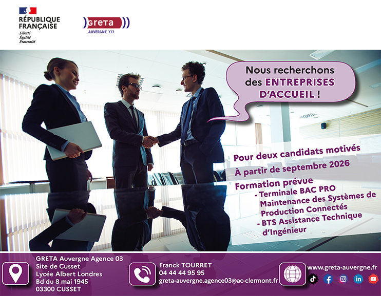 Fidèle à son action pour accompagner les entreprises à la formation de leurs futurs collaborateurs, le Greta Auvergne recherche deux entreprises pour intégrer dans leurs équipes deux candidats engagés dans un parcours de reconversion à partir de Septembre 2026
