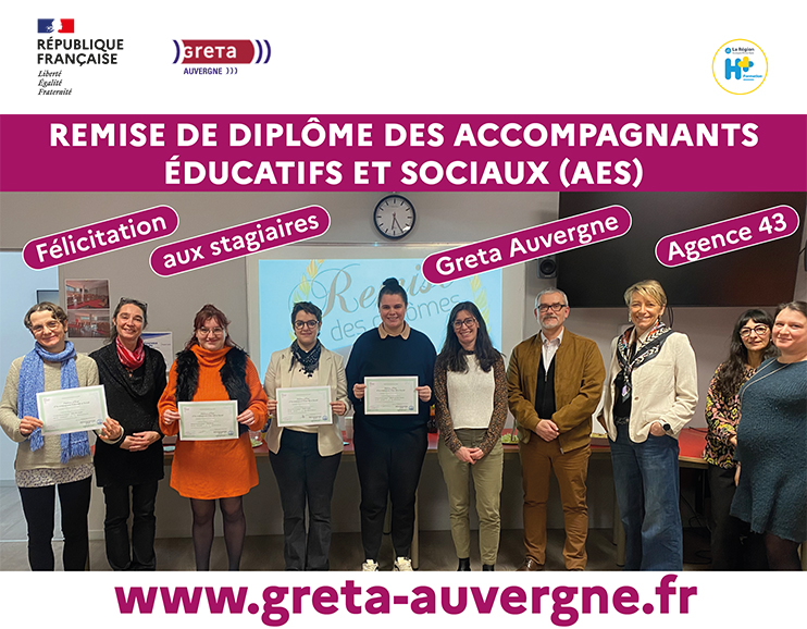 La remise de diplôme des Accompagnants Éducatifs et Sociaux (AES) de la promotion 2024-2025 s’est tenue ce vendredi 23 janvier 2026 au sein du Greta Auvergne Agence 43 du Puy en Velay, dans une ambiance chaleureuse et empreinte de fierté collective.